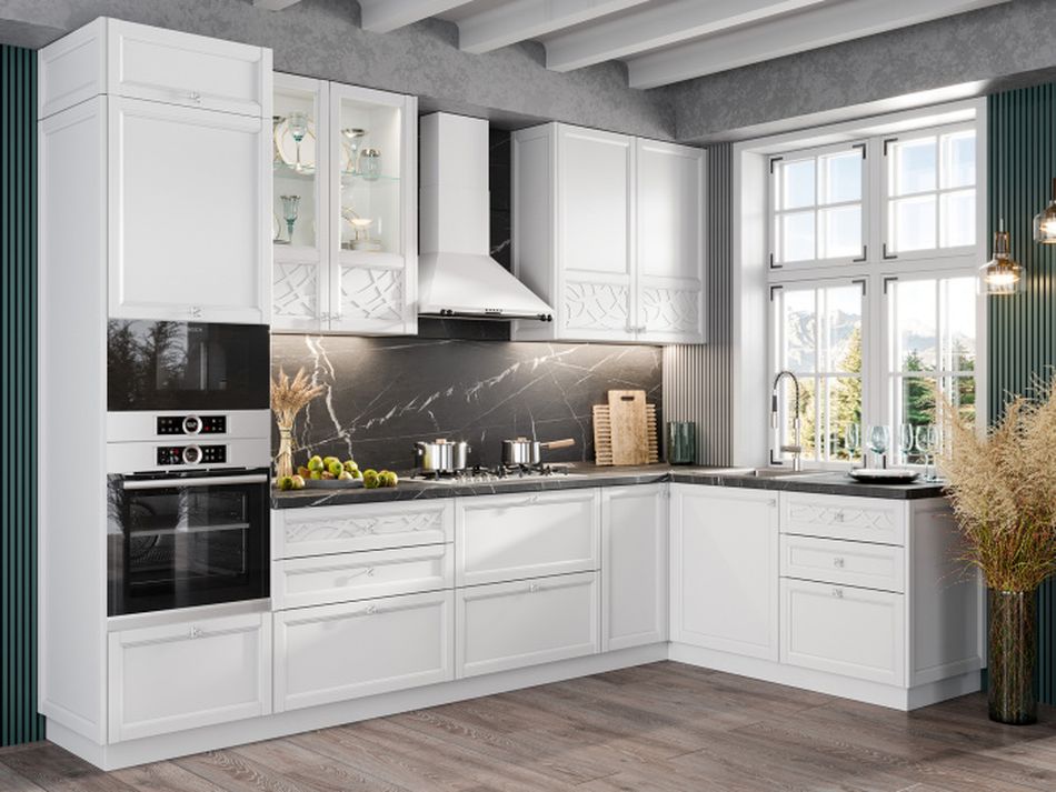 - Фасады представлены в белом цвете, задающем тон всей кухне.