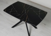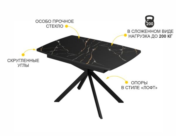 Орфей 46 Мрамор черный это дизайнерский стол-трансформер, который оценят любители всего нового и необычного. Благодаря сочетанию мягких линий и выразительной геометрии модель идеально вписывается в интерьеры в стиле минимализма, современного арт-деко и элегантной классики. Глубокий черный цвет столешницы с изысканным мраморным рисунком с золотистыми прожилками создает роскошный и выразительный образ. Внешние и конструктивные особенности модели За одну цену Вы фактически покупаете 3 обеденных стола один компактный для 6 персон и два с увеличенной столешницей на 8 или 10 персон. Дизайнерский рисунок Мрамор подчеркивает стильный внешний вид изделия и добавляет ему оригинальности. Рисунок нанесен с помощью специальной технологии, благодаря которой он не стирается и не выцветает со временем. Россыпь глиттера придает утонченное мерцание рисунку на столешнице, подчеркивает уникальность изделия и привлекает внимание. Стеклянная столешница красиво преломляет свет и визуально расширяет пространство. Скругленные углы и края столешницы уберегают от травм и обеспечивают дополнительный комфорт при эксплуатации изделия. Вставки для увеличения ширины столешницы выполнены из ЛДСП черного цвета. Замок для фиксации столешницы придает жесткость конструкции как в собранном, так и в разложенном виде. Позволяет надежно зафиксировать столешницу во время эксплуатации стола. Матовые металлические опоры в стиле лофт подчеркивают современный дизайн стола, а их оригинальная форма обеспечивает комфортную посадку за столом. Качественное порошковое окрашивание опор обеспечивает высокую стойкость к механическим повреждениям, ультрафиолетовому излучению, низким и высоким температурам. Заглушки из мягкого пластика защищают пол от царапин. Качественный пластик обеспечивает плотную посадку заглушек в опору стола и исключает их поломку. Надежность и безопасность в эксплуатации Стол обладает высокой прочностью, выдерживает нагрузку 200 кг в сложенном виде, а в разложенном 75 кг. Это больше, чем у многих производителей. Надежный механизм позволяет увеличить длину столешницы на 35 и на 70 см и обеспечивает длительную безопасную эксплуатацию стола. Столешница изготовлена из ЛДСП повышенной прочности. Материал устойчив к механическому истиранию и термическому воздействию. Выдерживает min 300 циклов истирания по ГОСТу min 65 что больше, чем у многих производителей. Выдерживает многократную сборку при переезде не возникнет проблем. ЛДСП класса эмиссии E1 данный материал безопасен для здоровья и рекомендован к производству мебели для кухни, спальни и детских комнат. Особо прочное стекло с полированной кромкой обеспечивает длительную безопасную эксплуатацию. Для предотвращения повреждения стеклянной столешницы горячую посуду следует ставить только наУсловия покупки