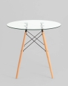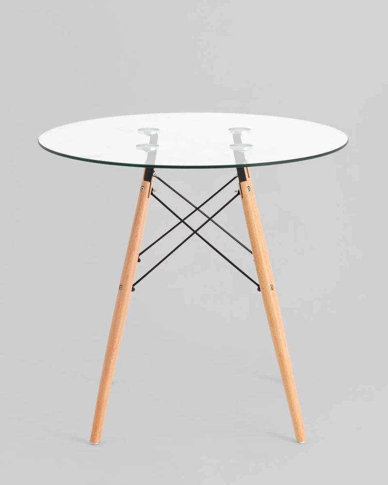 Стеклянный стол с круглой столешницей диаметром 80 см. Деревянные ножки изготовлены из массива бука - крепкие и устойчивые. Стол идеально сочетается с любыми стульями из коллекции DSW. Столешница изготовлена из прочного закаленного стекла и выдерживает нагрузку 80 кг, легко чистится. Благодаря стеклу, стол выглядит легким и невесомым. Визуальная легкость позволяет ему стать идеальным решением даже для небольшого помещения. Круглая форма стола, за которым могут комфортно разместиться четыре человека, располагает к приятному и непринужденному общению. Стол отлично подойдёт для гостиной, для кухни, для дачи, для ресторана или для кафе.Условия покупки