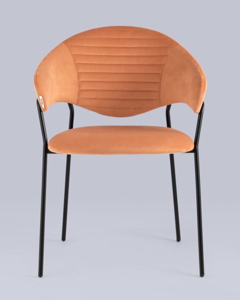 Комплект из двух стульев Алексис оранжевый. Стильный кухонный стул с оригинальной формой спинки, высокой поддержкой и подлокотниками. В качестве обивки используется мягкий велюр приятный на ощупь износостойкий, гигроскопичный материал. Металлический каркас в черном цвете огибает спинку и выступает аккуратным акцентом модели. Широкое сиденье обеспечивает удобную посадку и уют.Условия покупки