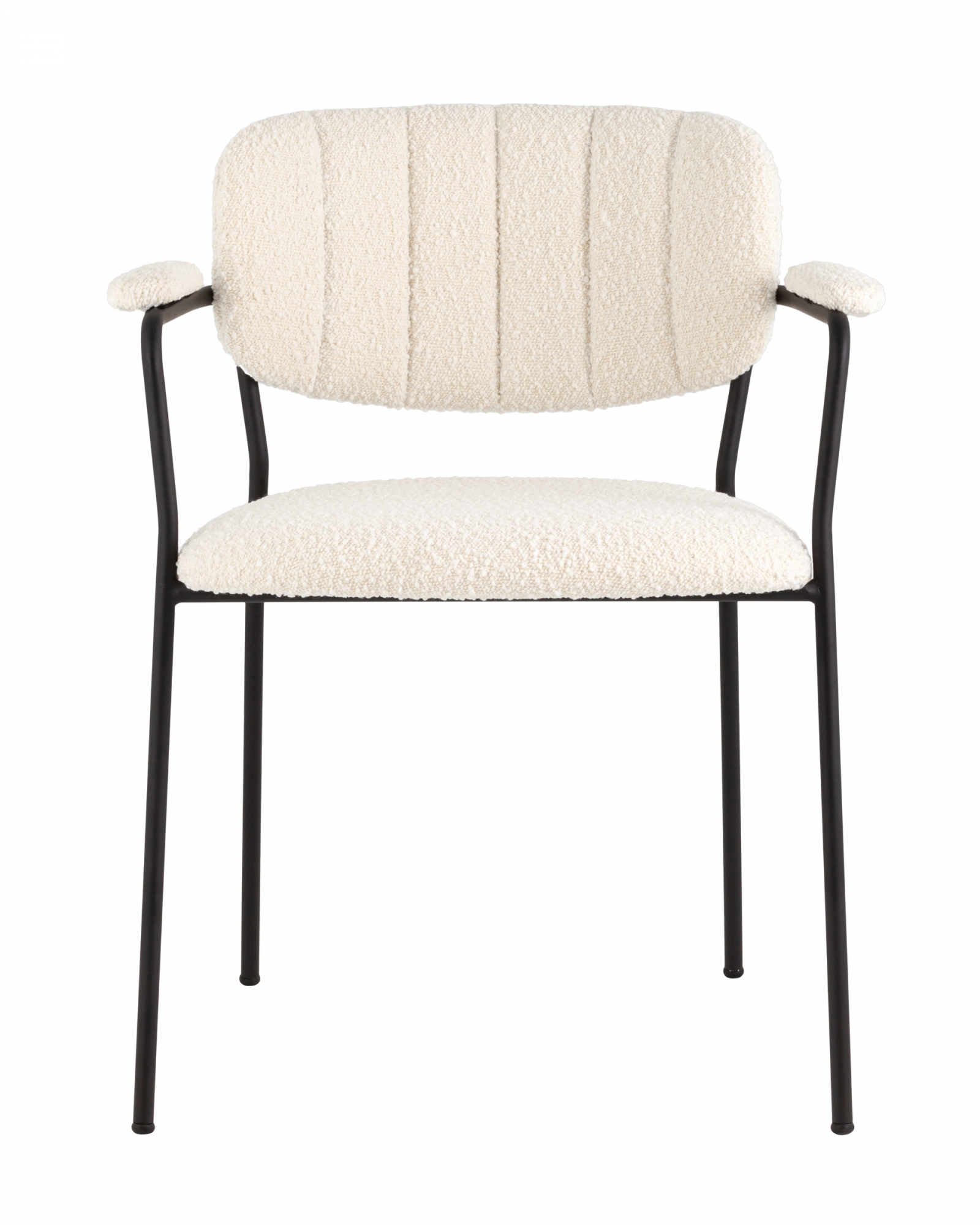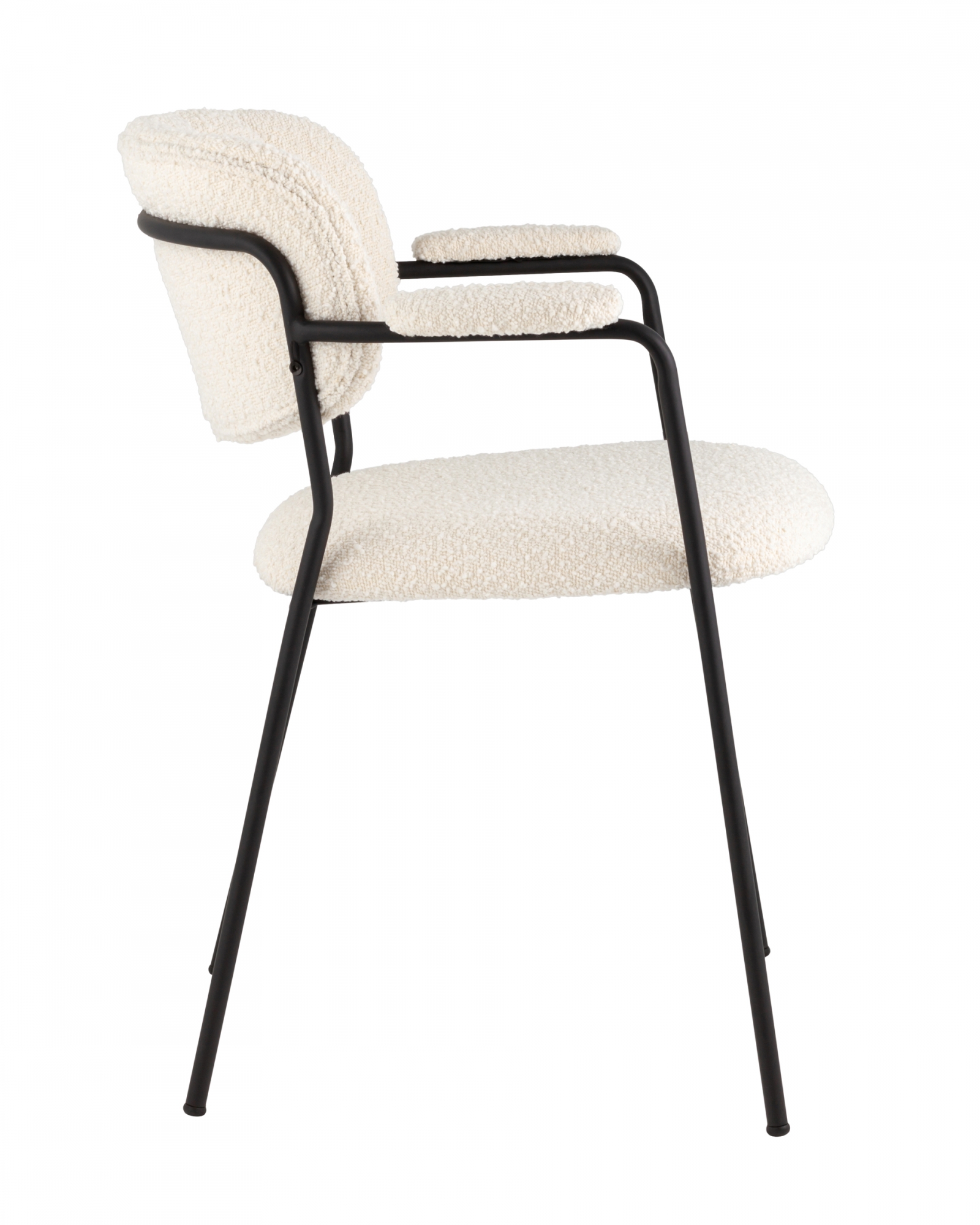 Современный обеденный стул с подлокотниками и металлическими ножками. Обивка выполнена из мягкой и легкой ткани букле. Красивый и очень мягкий материал, который оставляет ощущение теплоты и уюта. Металлический каркас черного цвета огибает спинку и плавно переходит из подлокотников в ножки. Широкое сиденье обеспечивает удобную посадку и уют. На подлокотниках для дополнительного комфорта предусмотрены мягкие накладки.Условия покупки