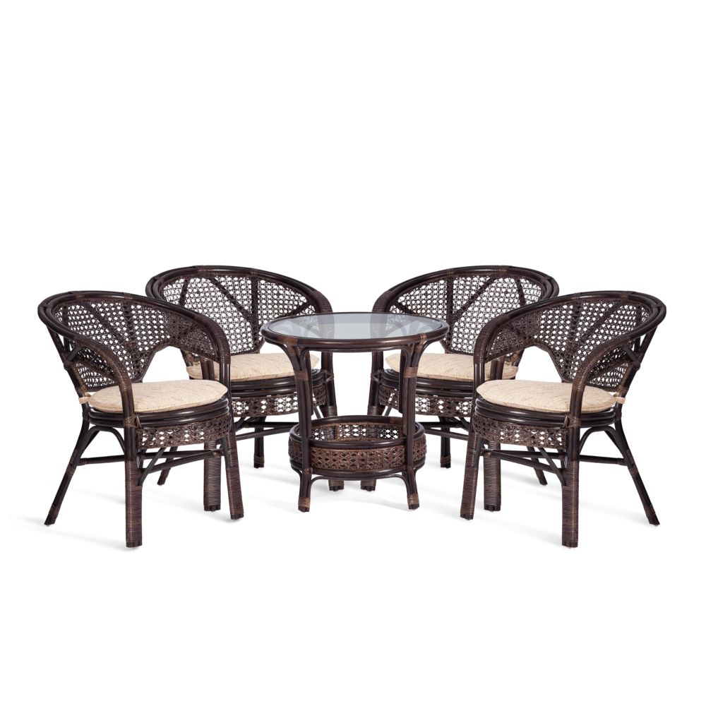 Комплект Tetchair PELANGI 02/15 стол со стеклом + 4 кресла с подушками ротанг, кресло 65х65х77см, стол диаметр 64х61см, walnut грецкий орех